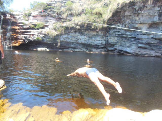 Sentados nos pedras semi preciosas esperamos pessoas passar por ali para aprendermos o caminho das cachoeiras. Apareceu um casal de gaúchos e depois mais duas meninas do Rio de Janeiro e juntos fomos pelas trilhas desconhecidas, mas identificadas por pegadas no chão batido e escadas de pedras, até chegamos no poço do Harley, com uma bela cachoeira.