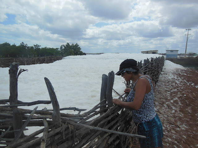 Ao chegarmos em Macau, passamos pelos tanques de decantação do sal, com bolhas de espumas se desprendendo e voando, cortando a estrada da única entrada da cidade.