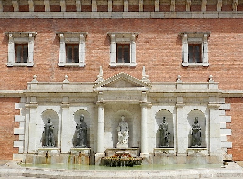 Passamos por várias ruas e, na Universidade de Valência, tem um monumento que chamou a atenção. Reparem que tem um bispo e um papa de um lado, um rei e uma rainha do outro e, ao centro uma mulher simples, semi nua, em destaque.