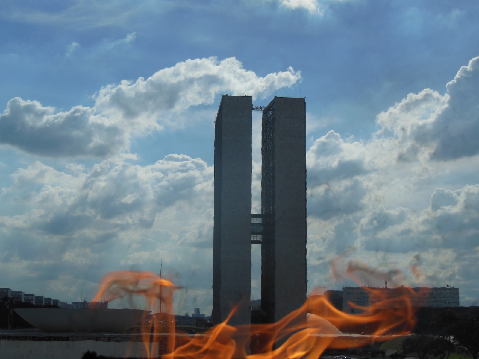 Não se alarmem, o Congresso Nacional não estava em chamas. Esta foto eu tirei por detrás do fogo, do alto da pira que fica acesa o tempo todo na Praça dos Três Poderes.