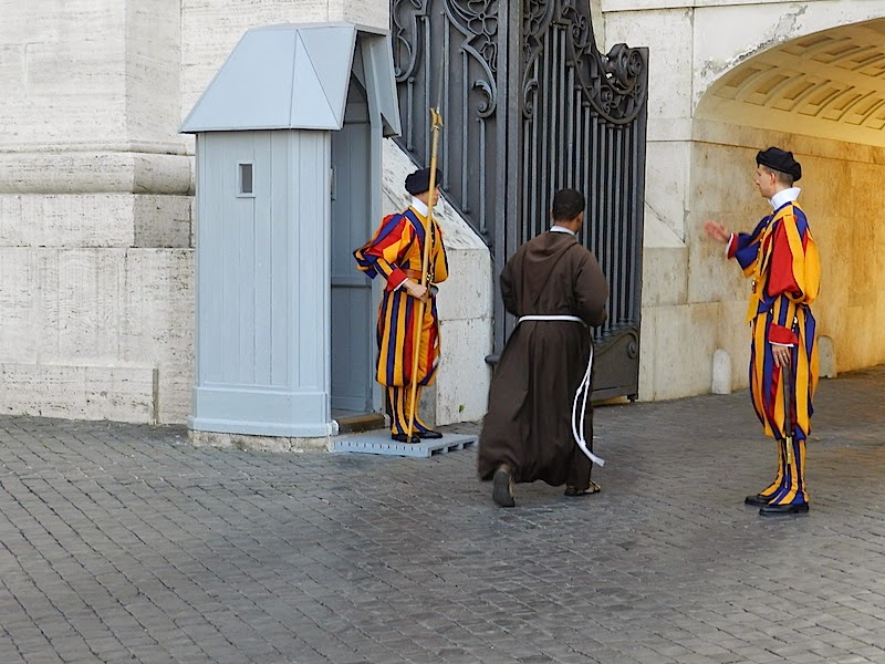 Interessante a mistura de costumes. A guarda do Vaticano, que mais parecem arlequim, fazem continência quando uma eminência passa, não tenho nada com isso, mas achei estranha a continência. Penso que a igreja não precisa desta similaridade com o exercito, pois são extremos, enquanto um existe e treina para matar se necessário, o outro treina e existe para dar vida a todos que necessitam.