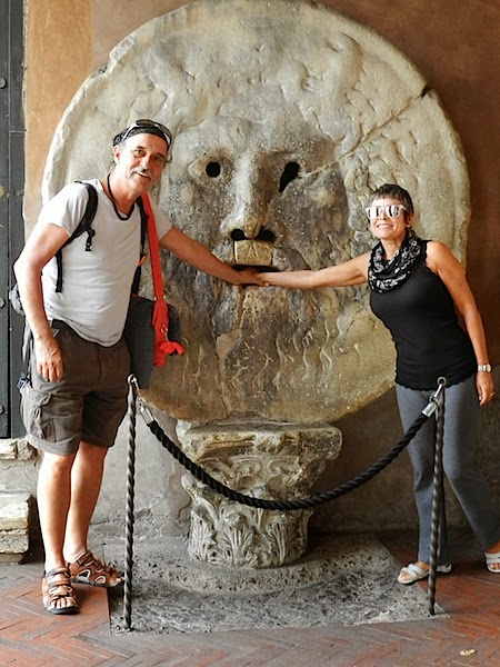 Paramos bem próximo e fomos visitar a igreja “Santa Maria in Cosmedin”, onde fica uma máscara, provavelmente uma tampa de esgoto do passado, esculpida em mármore, batizada como a “Bocca dela Verità”, boca da verdade.