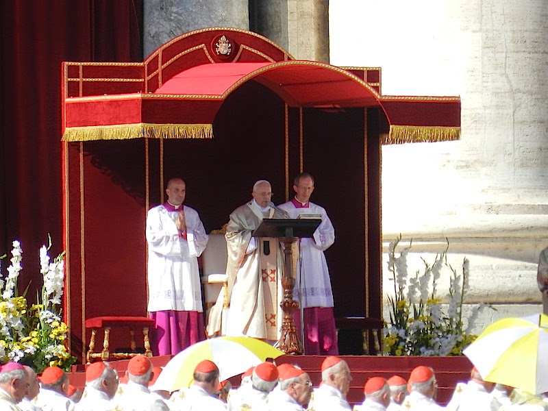 Puxando imagens pelo zoom da máquina, depois com o binóculo, desconfiamos que o Papa estava na praça a celebrar uma missa. Perguntamos e descobrimos que era mesmo o papa Francisco e mais, Bento XVI também estava na praça, junto com 200 Cardeais, muitos Bispos, padres, freiras e coroinha também, na presença de dezenas de milhares de pessoas.